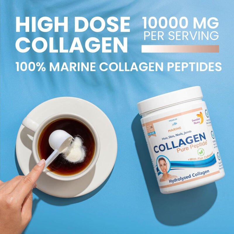 Each serving contains a 12,500 mg dose of Marine Collagen, type 1 and 3, hydrolyzed into low molecular weight Collagen for excellent absorption, enriched with active ingredients such as Retinol, Hyaluronic Acid, Biotin and Vitamin C