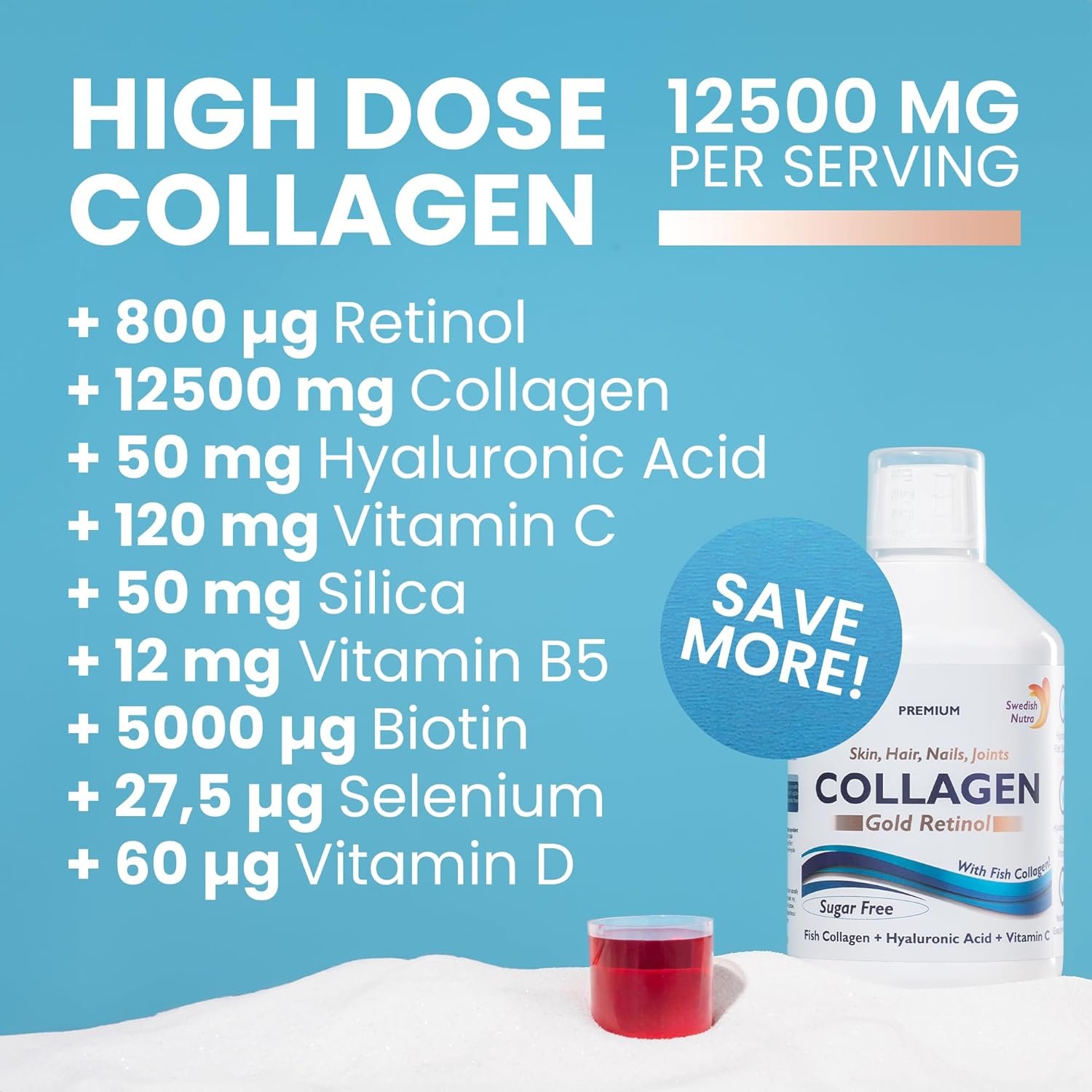 Swedish Nutra – Gold Retinol – 3 Packs of 500ml, 60 Day Supply – 12500 mg Marine Collagen I Sugar-Free I Minimize Fine Lines, Wrinkles & Improve Skin Elasticity